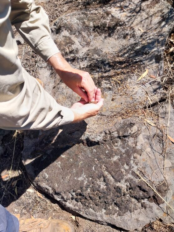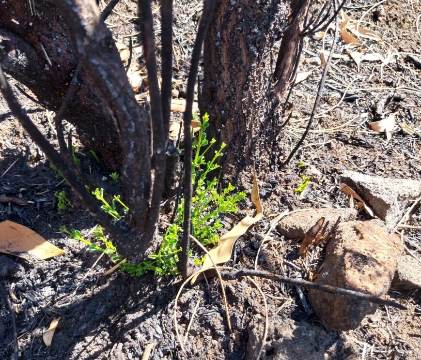While recovery efforts are ongoing, we had some positive news on our latest visit to the MacKinnon Nature Reserve. Critically Endangered Anchor plants (Discaria pubescens) that were growing on the rock rises had been completely consumed by fire, raising serious concerns for their survival. However, following recent rain, they have shown strong reshooting from the base, enabling seed collection by the Wadawurrung Caring for Country team.