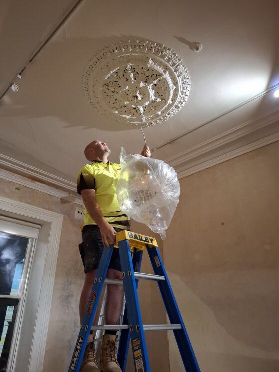 Plaster ceiling repairs were undertaken by traditional plasterer Ray Wiltshire using lime plaster made with a reactive ‘quick lime’ as was used by plasterers when Tasma Terrace was first built. This can be seen at the rear of the retail space behind the curtained store and dressing area.