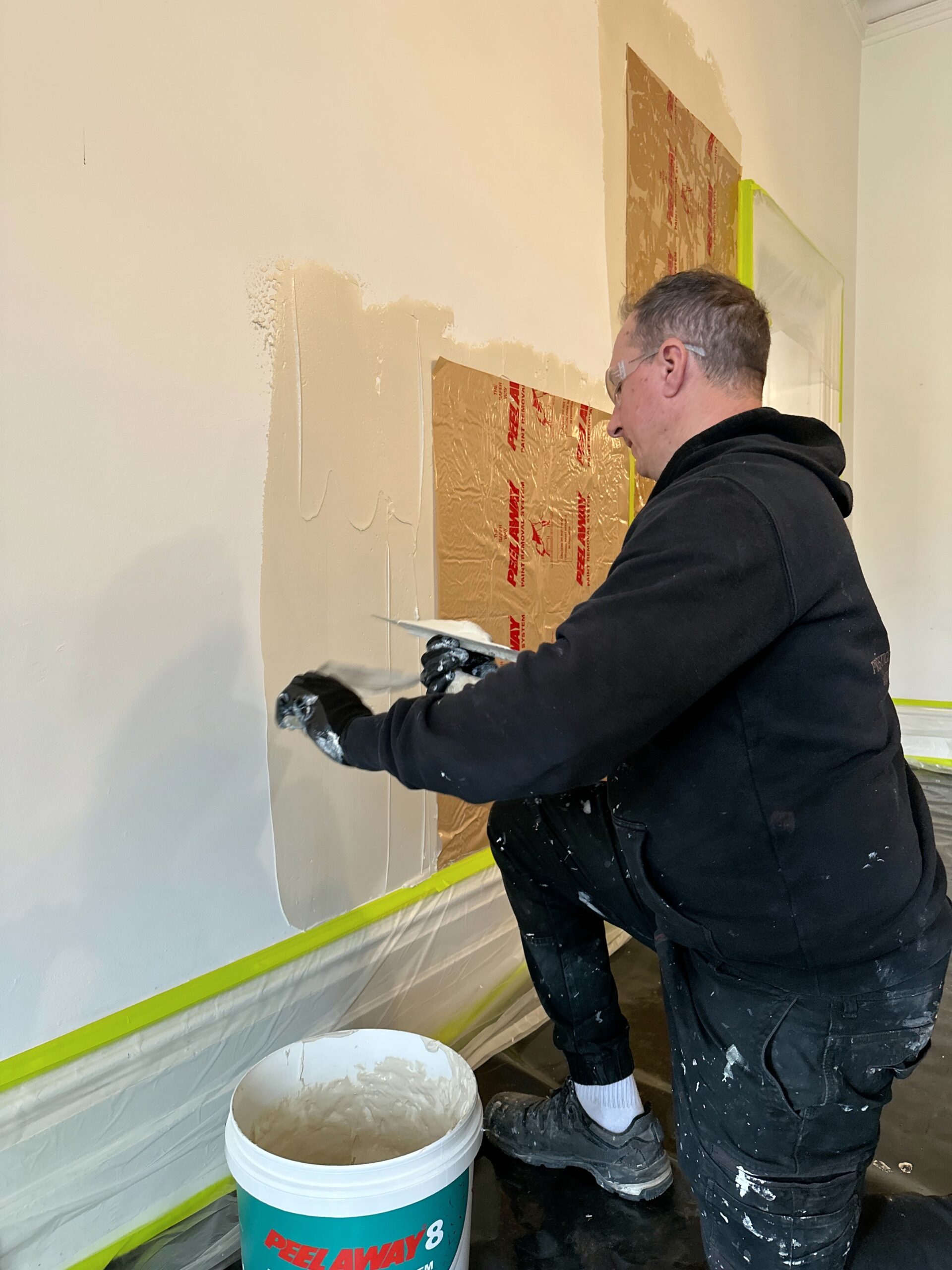 With reference to the Conservation Management Plan for Tasma Terrace, the team embarked on the removal of later white acrylic paint (containing plastic) and the 1970s era paint from the walls of what is now the retail and exhibition spaces. Prestigious Painting and Decorating Services used the Haymes Peelaway 8 System, made right here in Victoria, to safely remove the paint without damaging the plaster underneath. This product was not applied to the joinery or plaster details which have layers of earlier finishes, or to walls where wallpaper is present under such as in the hallway between the exhibition and retail space.