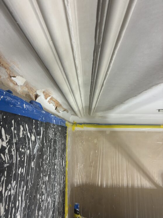 This area showed signs of damage from previous damp or water ingress, and the installation of cabling under the floor which dislodged the plaster from the timber laths it was applied to. This repair was done completely in situ by building up the plaster layer by layer before running templates over it to achieve the finished result as shown below.